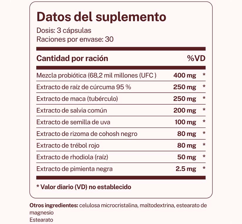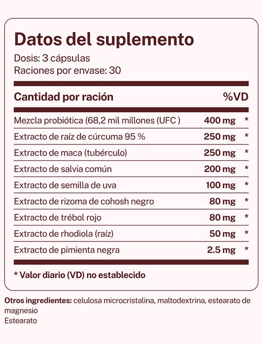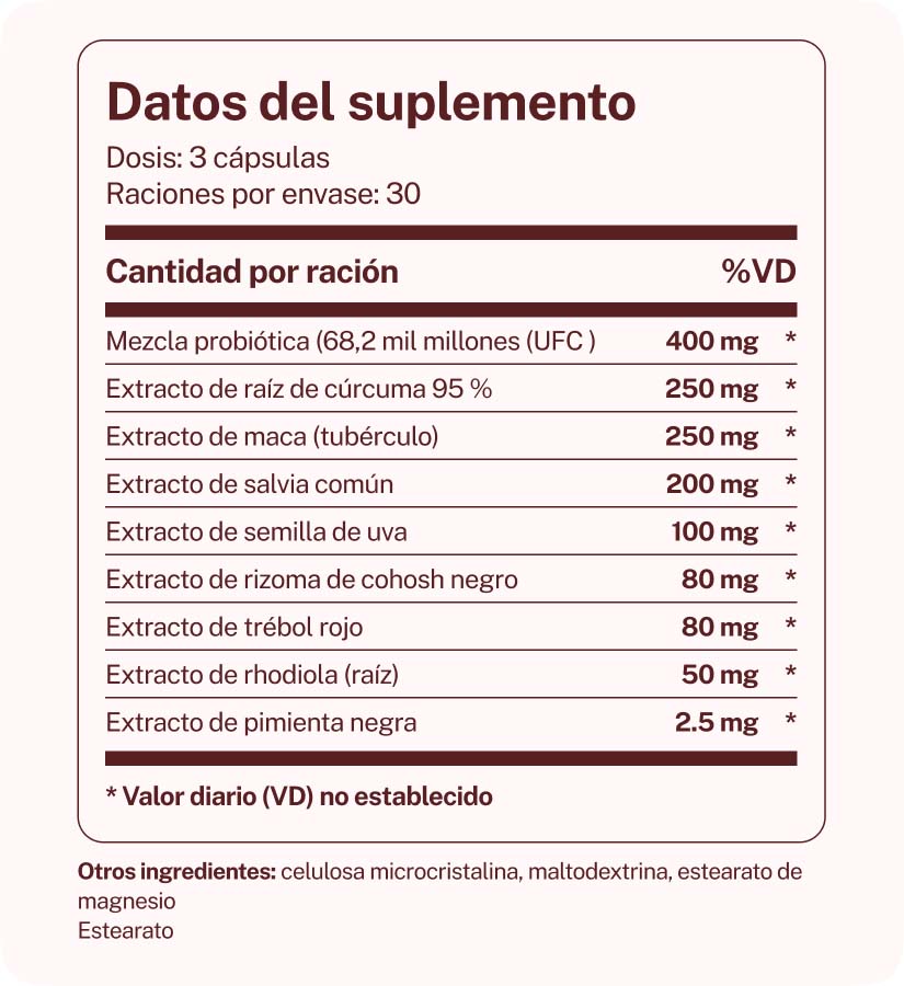 La mezcla de raíz de maca, extracto de rizoma de cohosh negro y extracto de trébol rojo ha sido formulada especialmente para aliviar los síntomas de la menopausia.