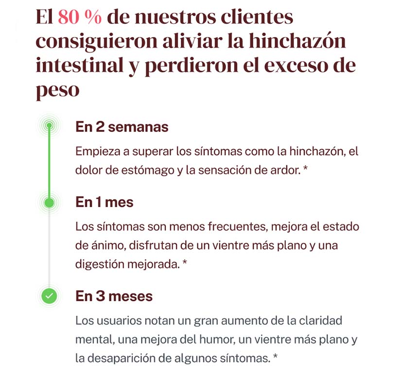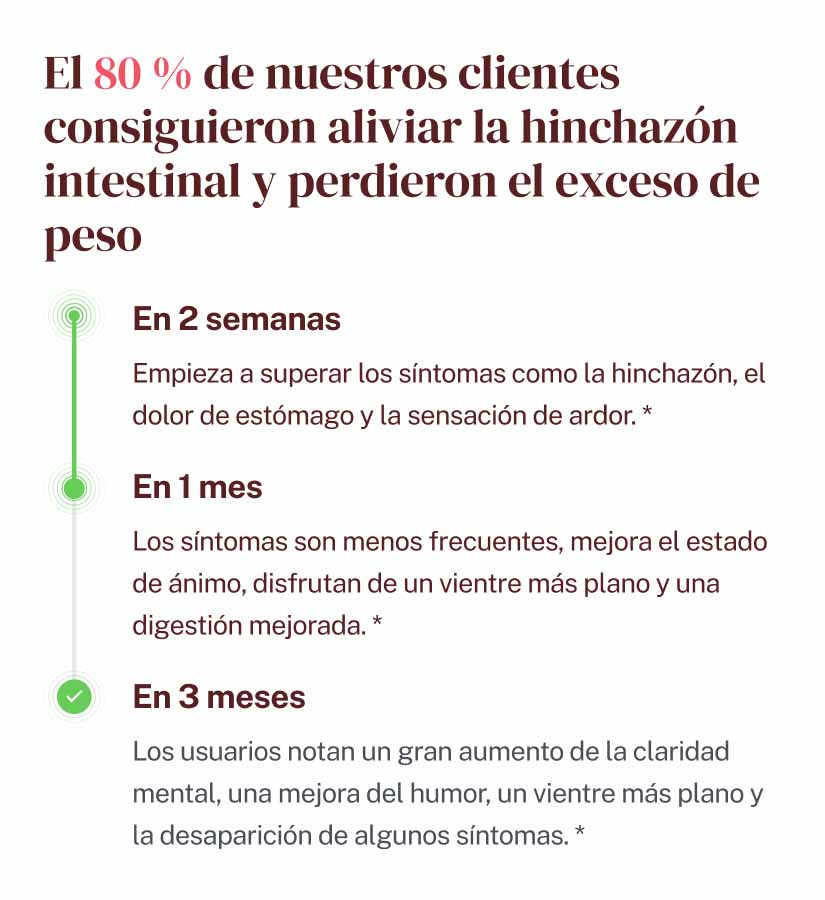 Los síntomas disminuyen, tu estado de ánimo mejora, y disfrutas de una barriga más plana y una digestión óptima.*